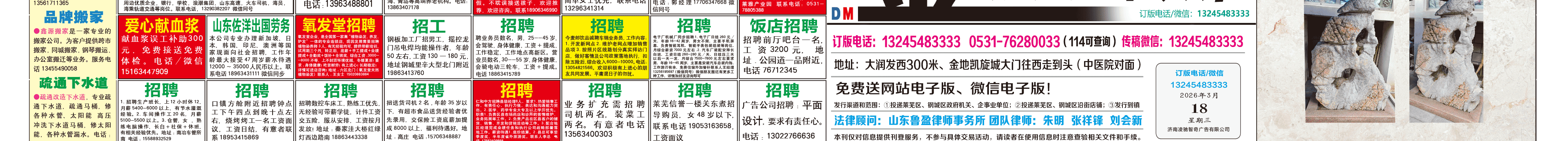 《萊蕪金點(diǎn)子廣告》報(bào)紙3月18日三、四版 http://www.viedano.cn 發(fā)布日期:2026/3/18 9:27:46 文章作者:萊蕪金點(diǎn)子信息港