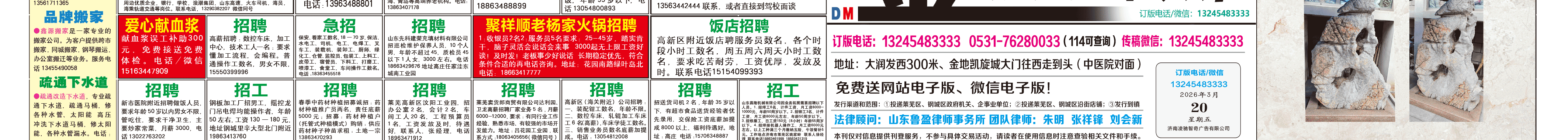 《萊蕪金點(diǎn)子廣告》報(bào)紙3月20日三、四版 http://www.viedano.cn 發(fā)布日期:2026/3/20 9:39:15 文章作者:萊蕪金點(diǎn)子信息港